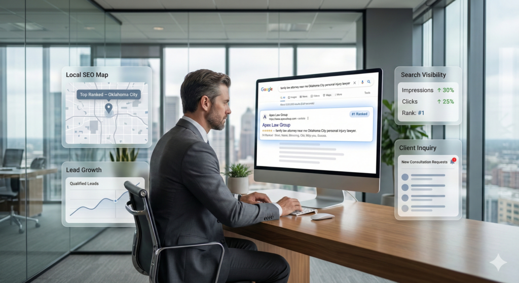 When potential clients search “family law attorney near me” or “Oklahoma City personal injury lawyer,” your firm should appear at the top of the results, not buried on page two. Strategic law firm SEO turns your website into a steady source of qualified leads.